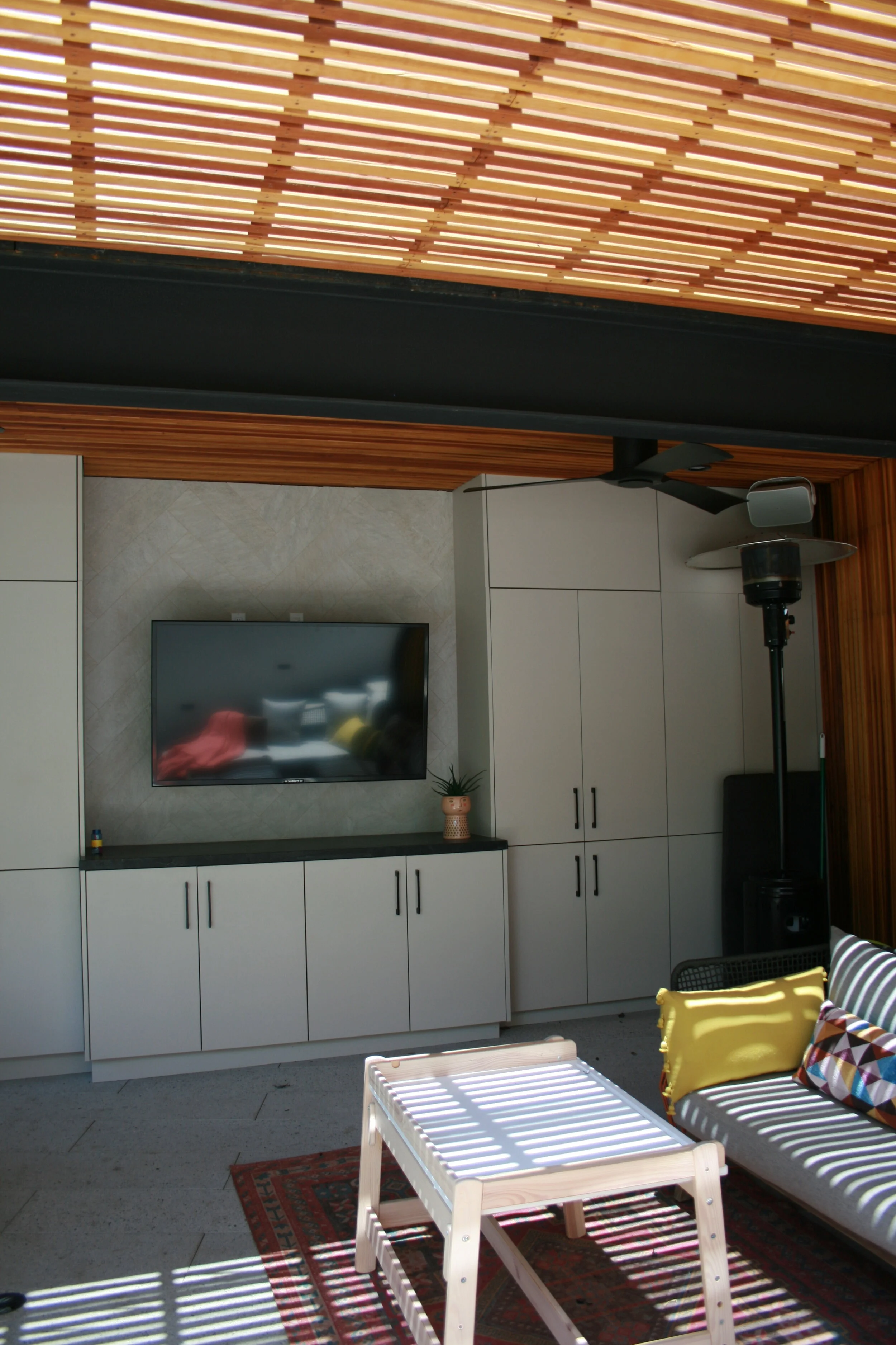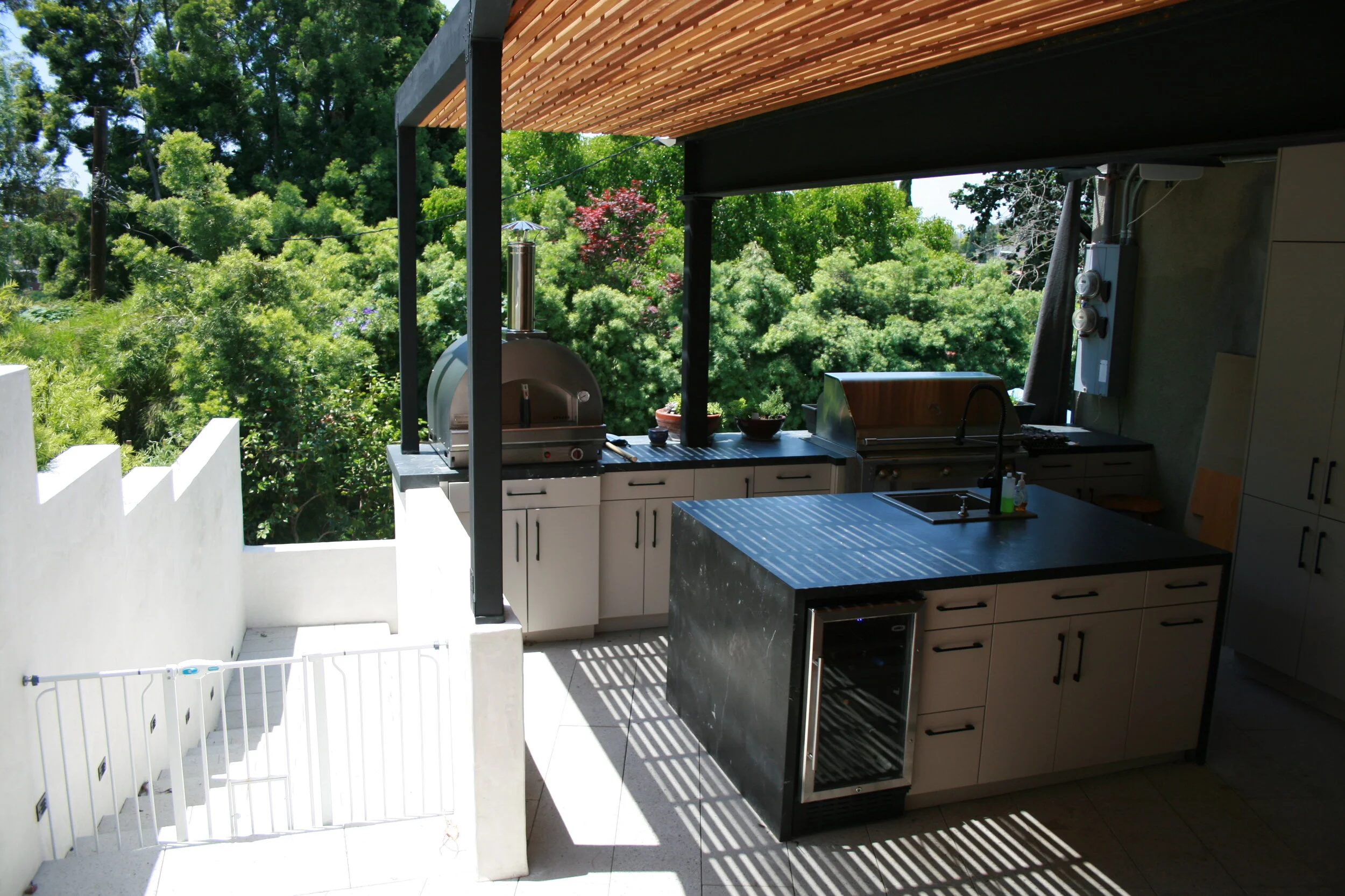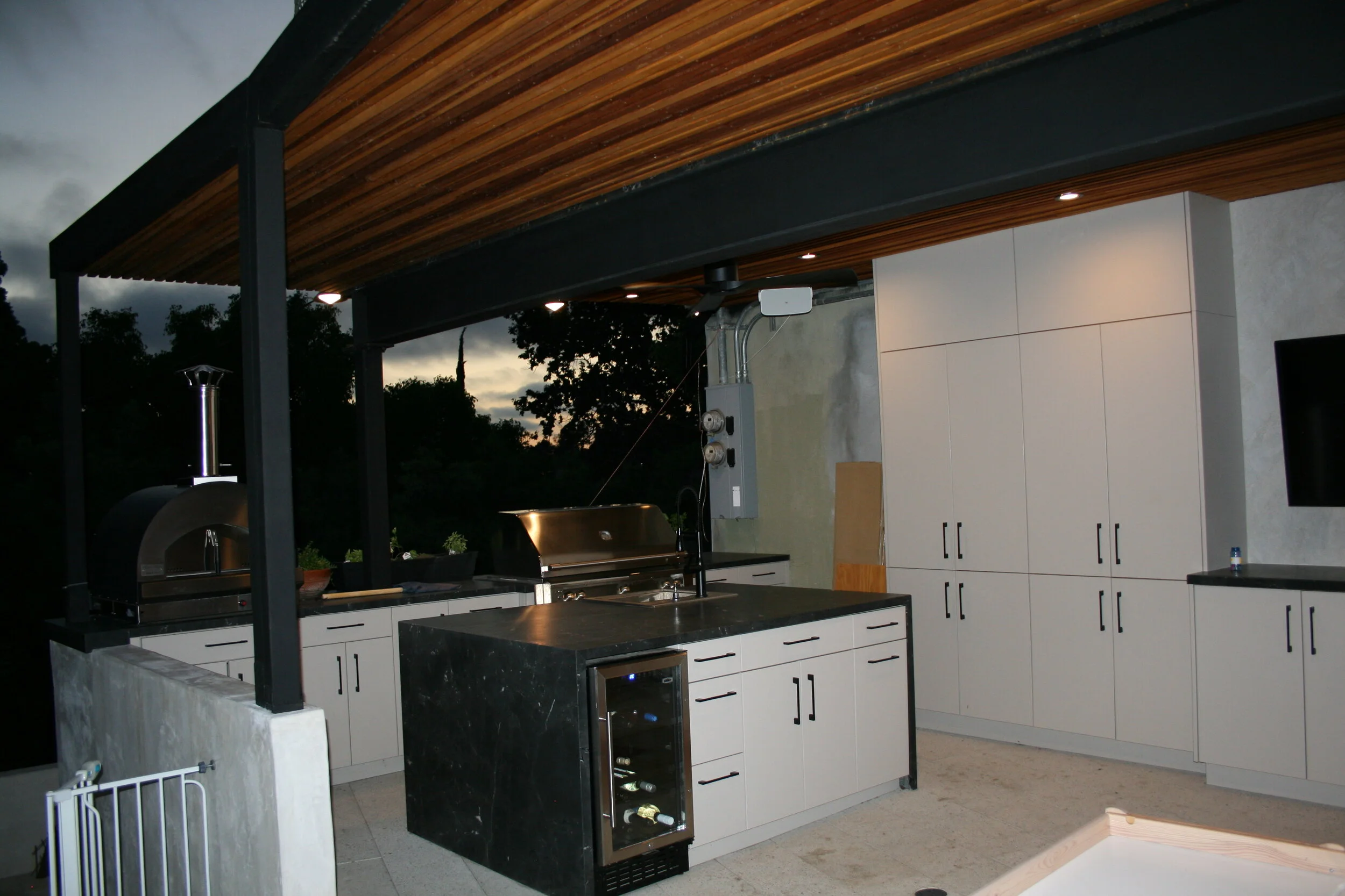 The existing property sits on a very steep lot. A side yard was not utilized and a bit of a wasted land. With series of retaining walls we created a vast open living space, partly covered by a rebuilt huge balcony/terrace above. The new outdoor living space allows for a sitting area with a big TV screen and a full size outdoor kitchen with a pizza oven, a BBQ, a wine cooler and an under counter refrigerator. A row of storage space cabinetry hides the existing side façade, covered with plumbing and electric connections, which still are accessible for inspection behind the cabinetry doors.