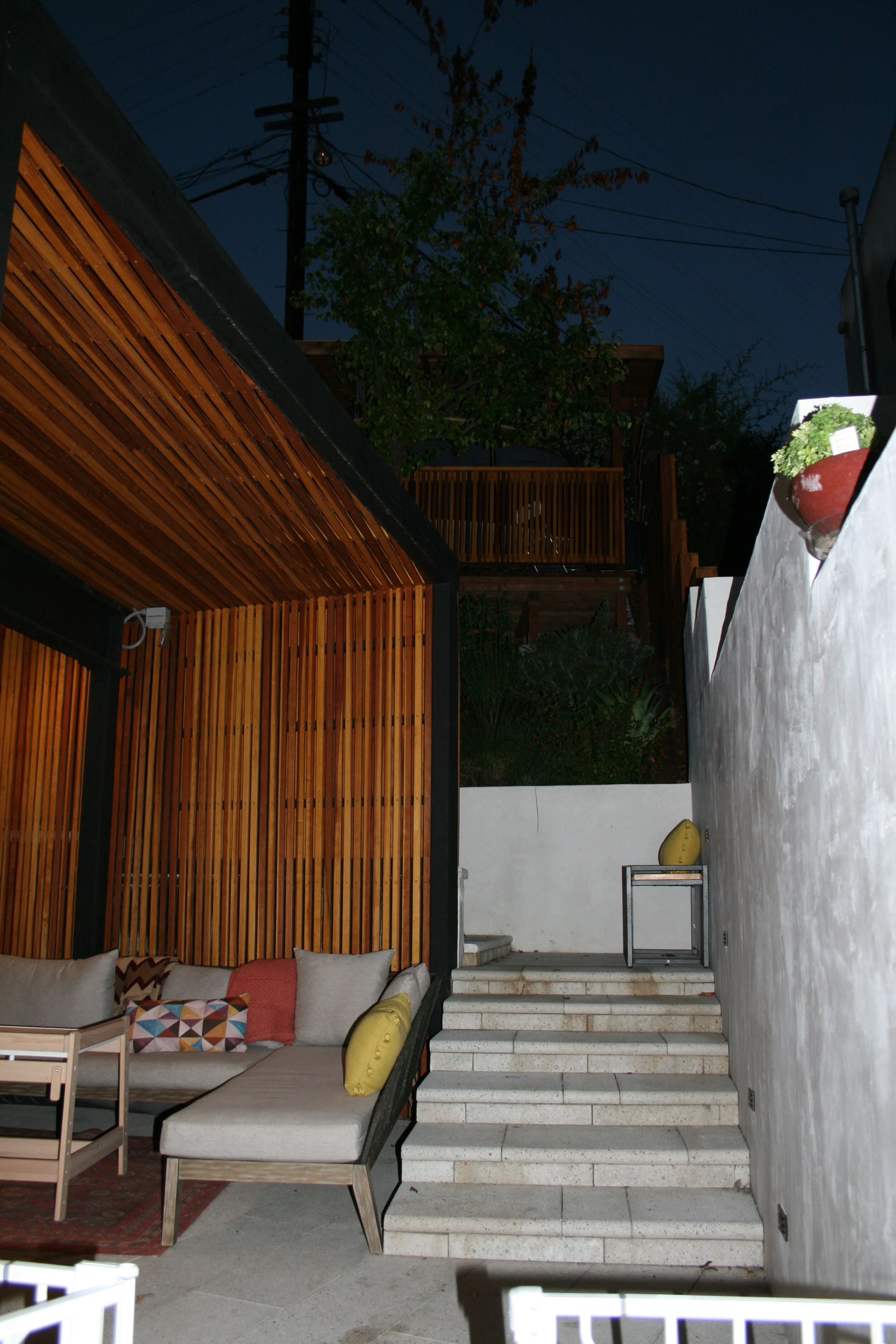 Several flights of garden size steps lead down the hill towards a big open back yard. The retaining walls gave the opportunity to create two big planters for herbs and vegetables used in the outdoor and indoor kitchens. On the top of the property, near the street level, we created a cover shed, complimentary in architecture to the outdoor living space, for the owner’s hobby – a rack for his surfboards. Thus a wasted very steep side yard with good dimensions was turned into a Southern California outdoor living space – a true addition to the existing 3 story home.